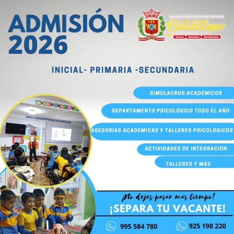 En el centro educativo Virgen de Guadalupe contamos con los tres niveles educativos Inicial, Primaria y Secundaria.
